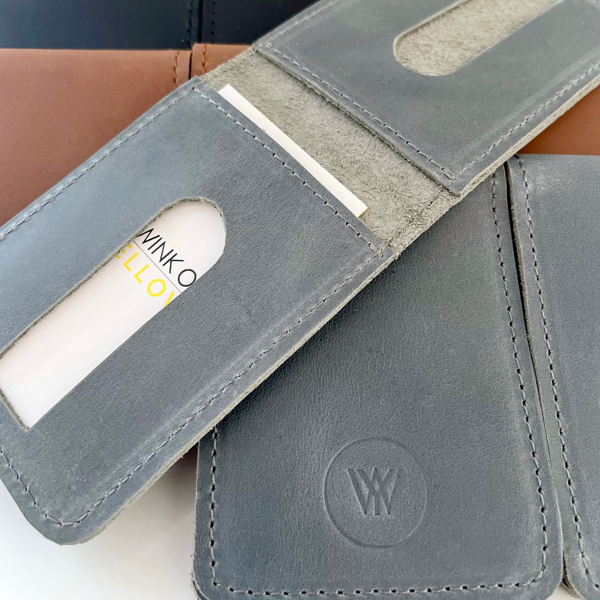 Butter soft leather card-holder wallet, handmade with highest quality construction. Our favorite color, gray with navy tones.