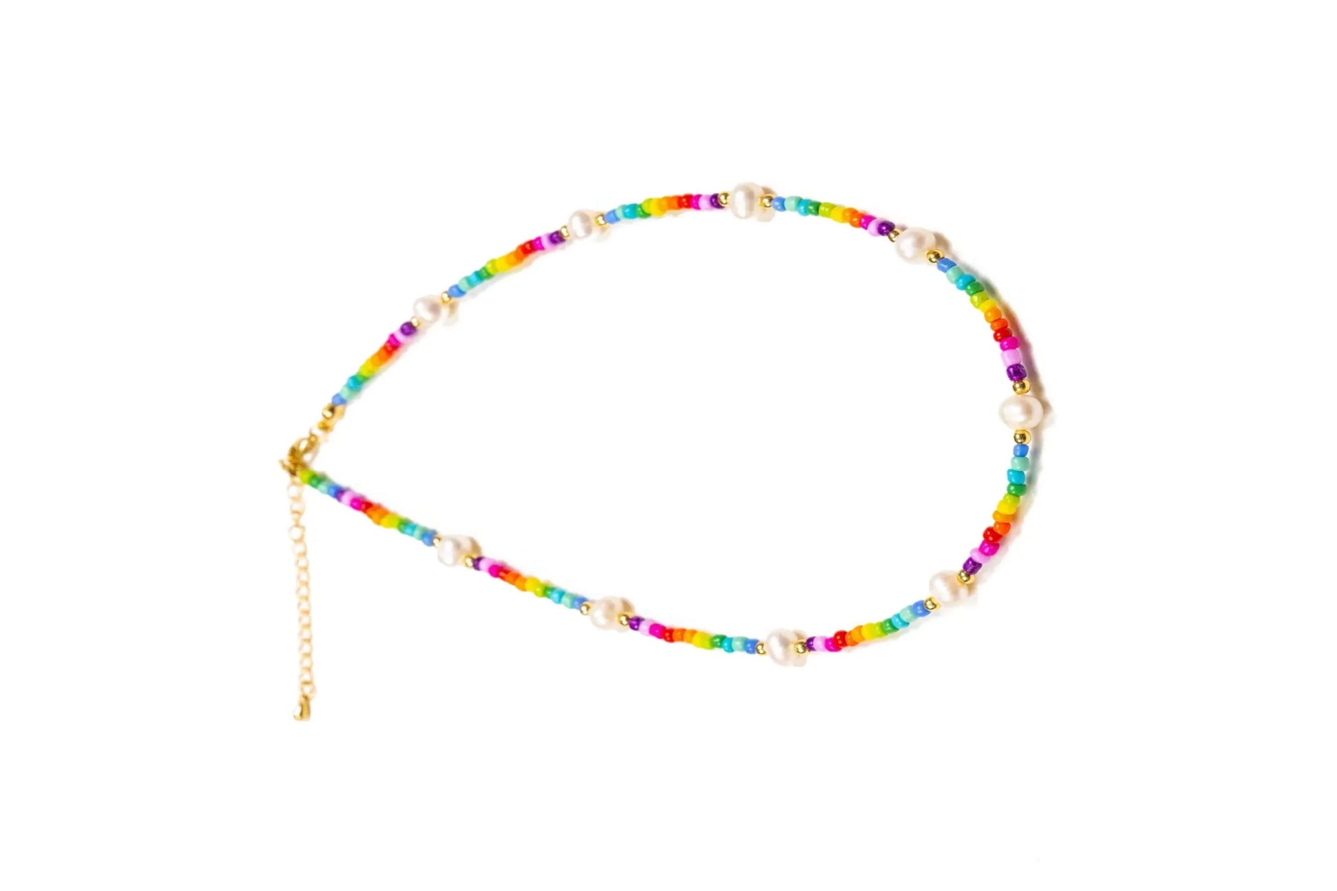 This Rainbow & Pearl Necklace (single) makes the cutest Gift! Girls of all ages love this style! A great addition to a girl's collection. It has a lobster clasp closure for ease.
